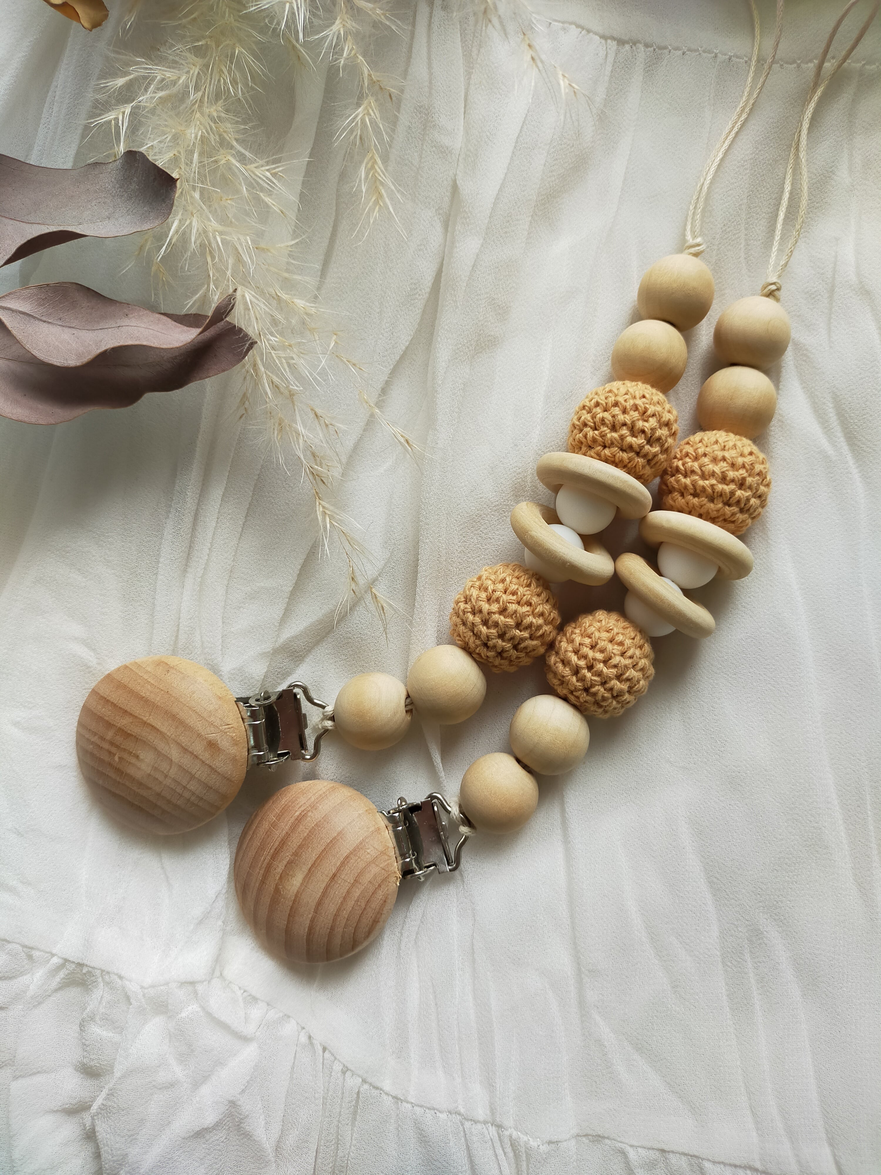 BPAフリーのシリコンビーズ、無塗装のオーガニックウッドビーズやパーツを組み合わせて作ったホルダーです。